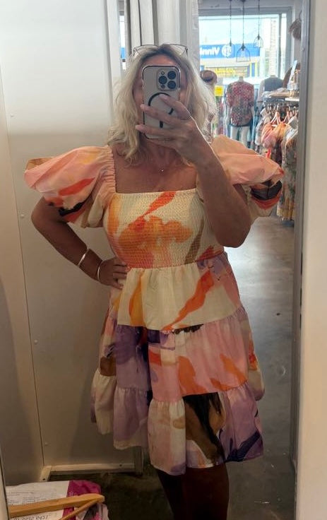 Stunning off-shoulder tiered mini dress with a shirred bodice and puff sleeves, featuring an abstract multi-color print.
