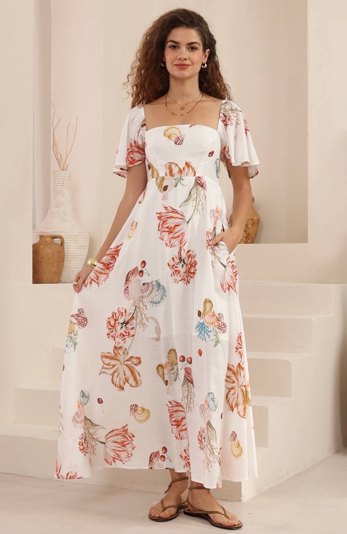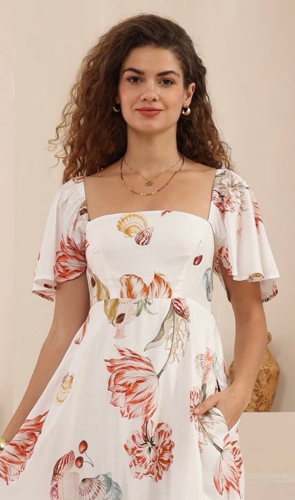 Gorgeous new La Poire maxi dress by Iris maxi. Features a super flattering bodice, shirred at back for a perfect fit. The flutter sleeves can be worn loosely on the shoulder or relaxed off the shoulder.