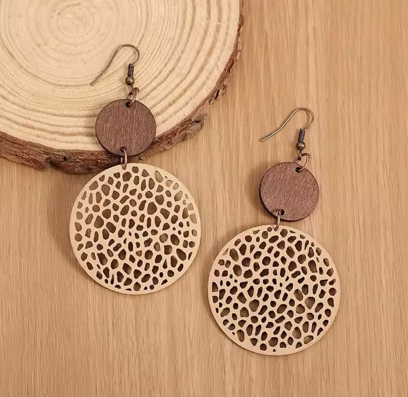 Beautiful Vintage style Hollow Out Disc Frosted Earrings. Leather & wooden dangle statement piece.