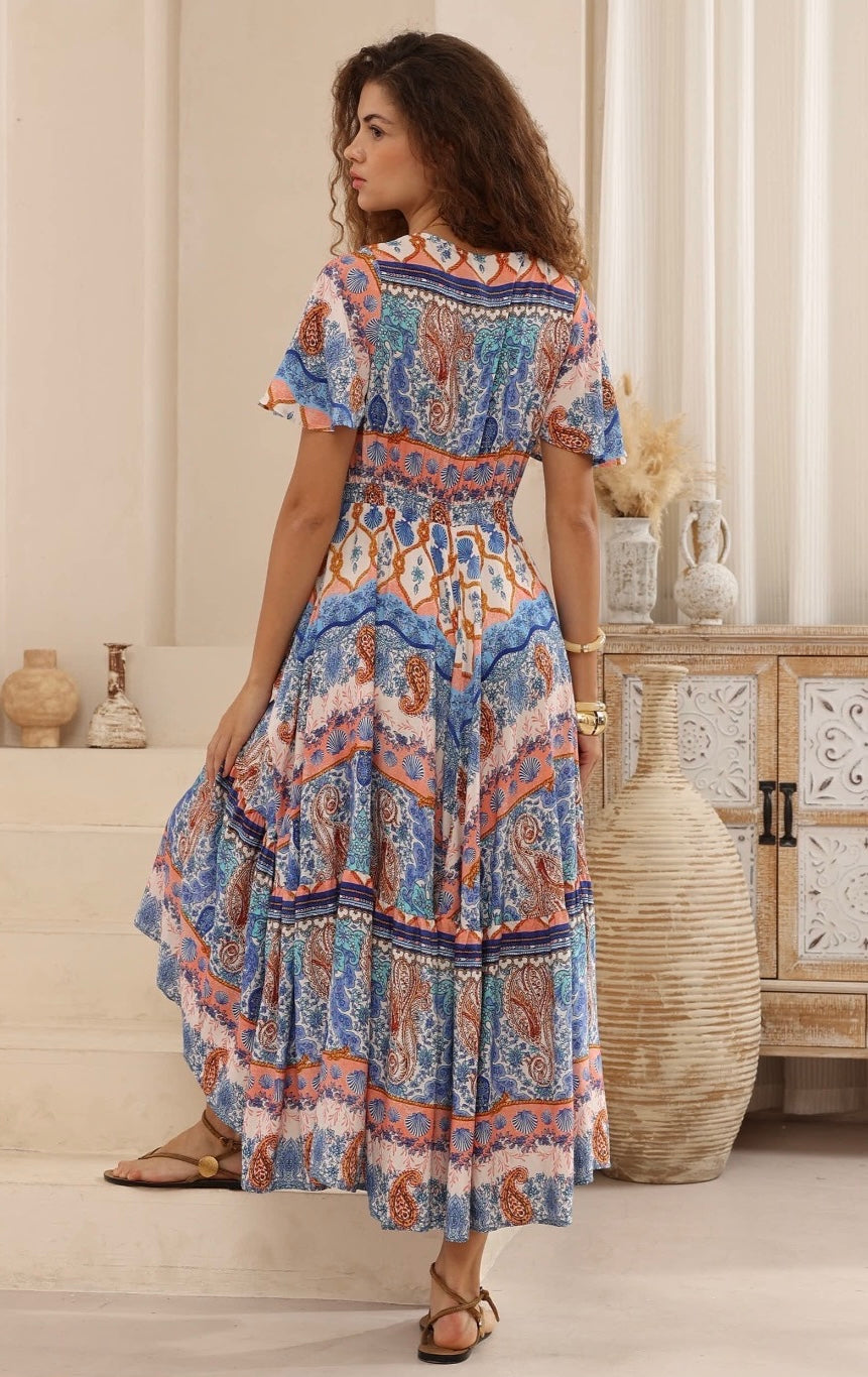 The Isa Blue Maxi Dress features a gorgeous V-Neck leading to buttons. This dress is flowy, roomy and a great all-round Summer Dress.