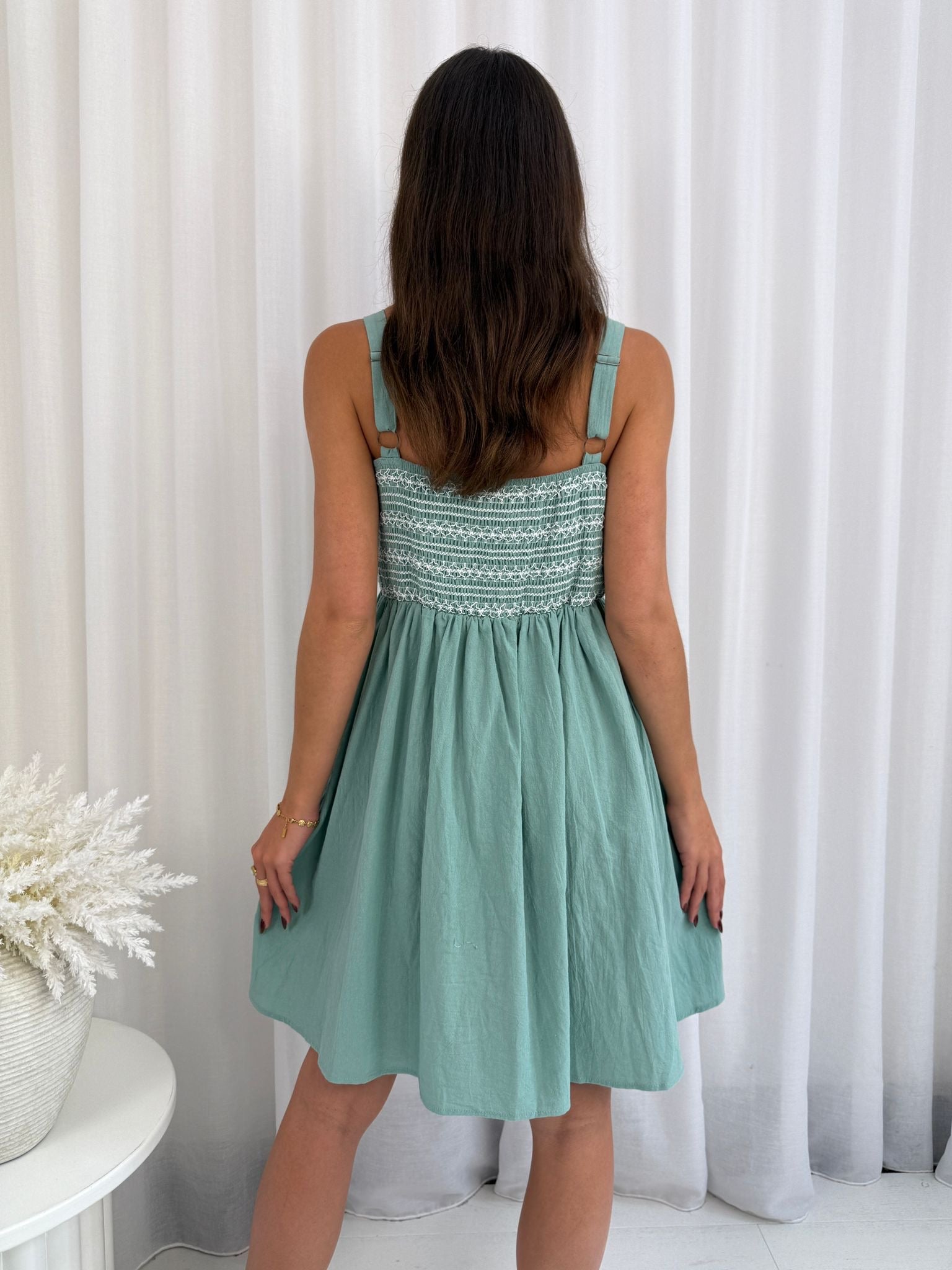 Our Lola Dress comes in beige & Sage colours. Your new favourite happy dress, this piece is designed with spaghetti straps, square neckline, smock on bodice, flowy a-line skirt & side pockets.