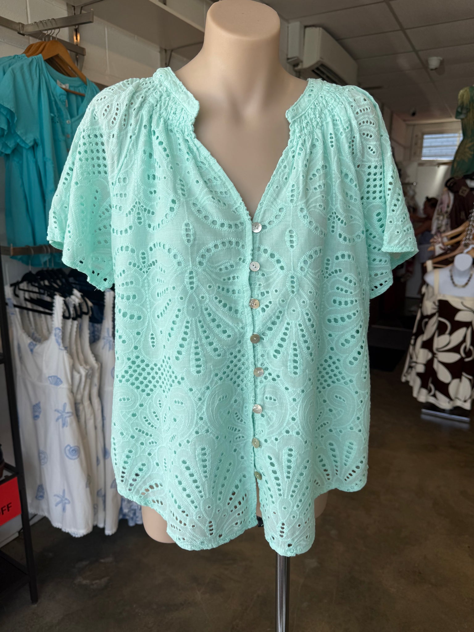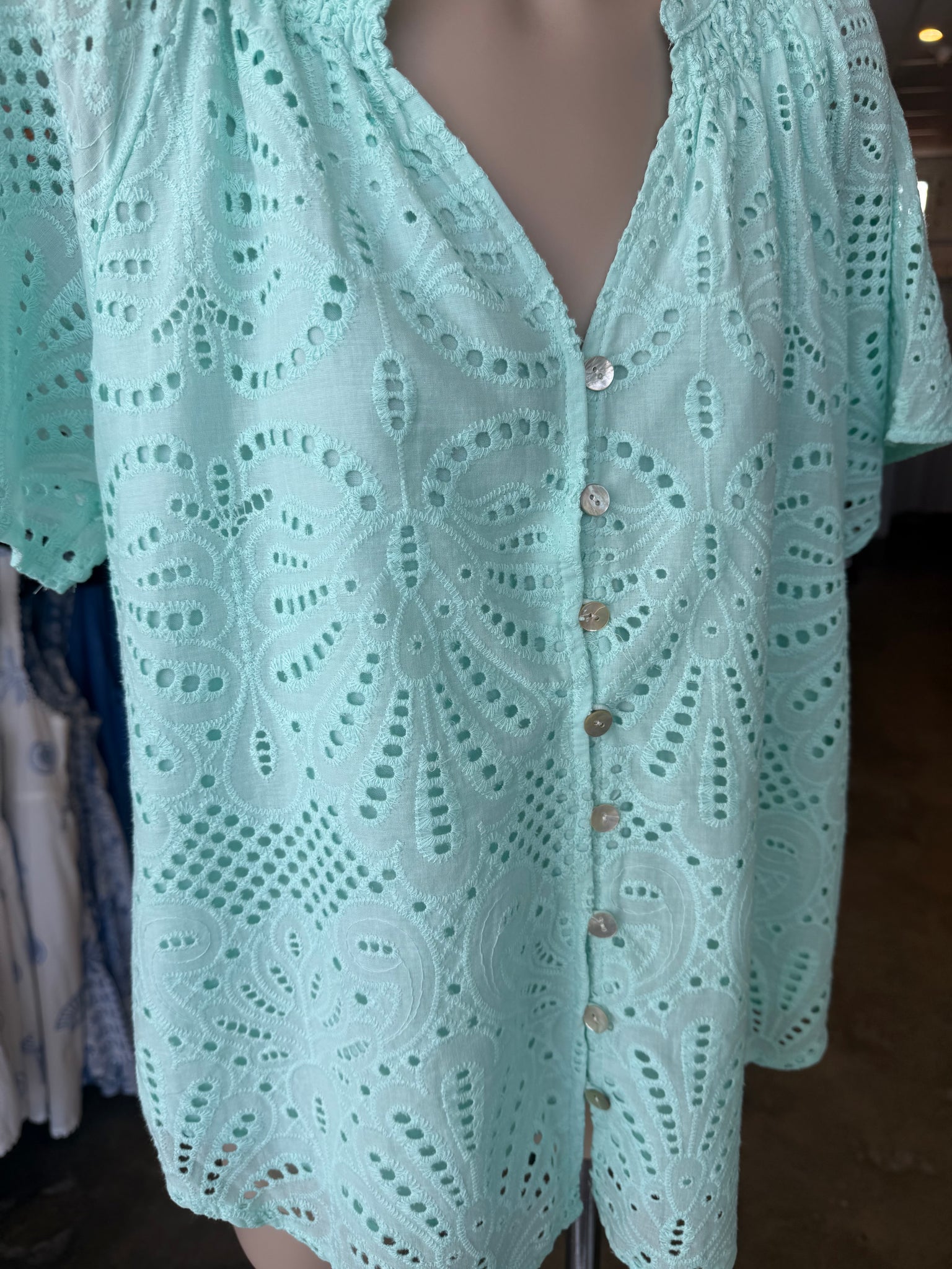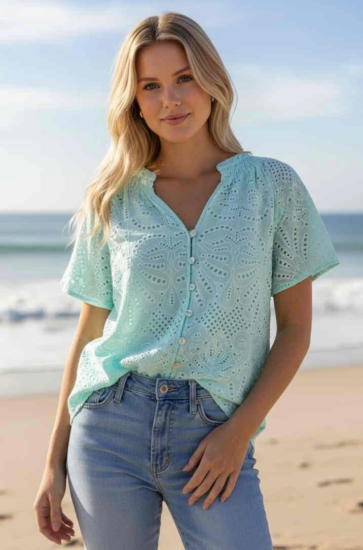 Fun and breezy, the Serena Top in mint anglaise is perfect with denim for casual days or styled with tailored shorts for a polished look.