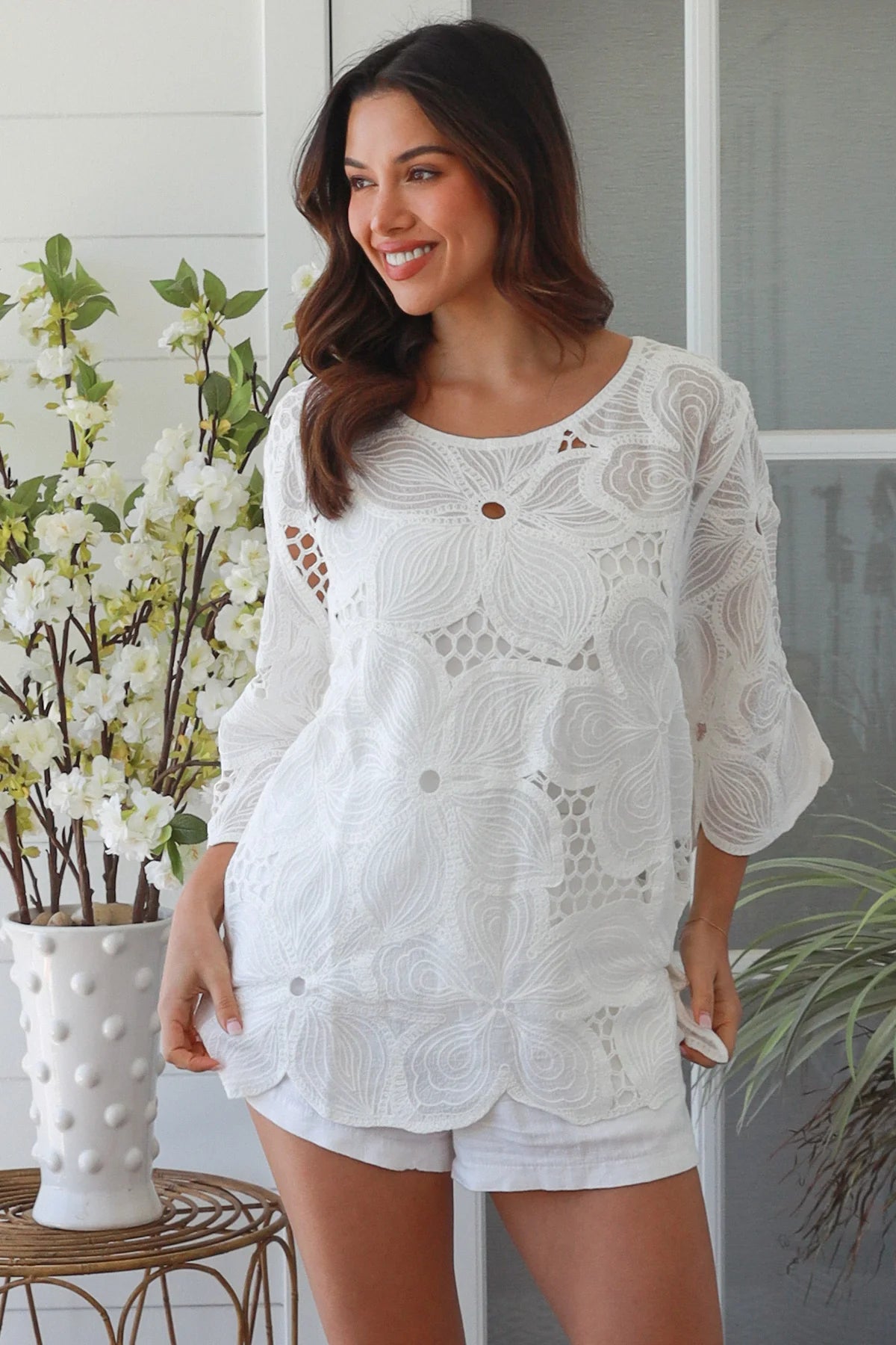 The Willa white embroidered cotton top is made for summer. Crafted from 100% cotton, it features delicate floral embroidery throughout, balanced with honeycomb crochet that keeps the fabric light, breathable, and easy against the skin.