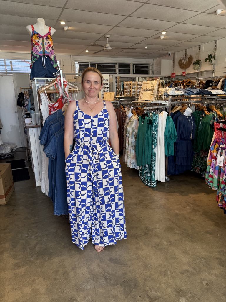 Step into vibrant style with Blue Geo Jumpsuit. This eye-catching ensemble features a playful V-neckline and adjustable shoulder straps for a customised fit.