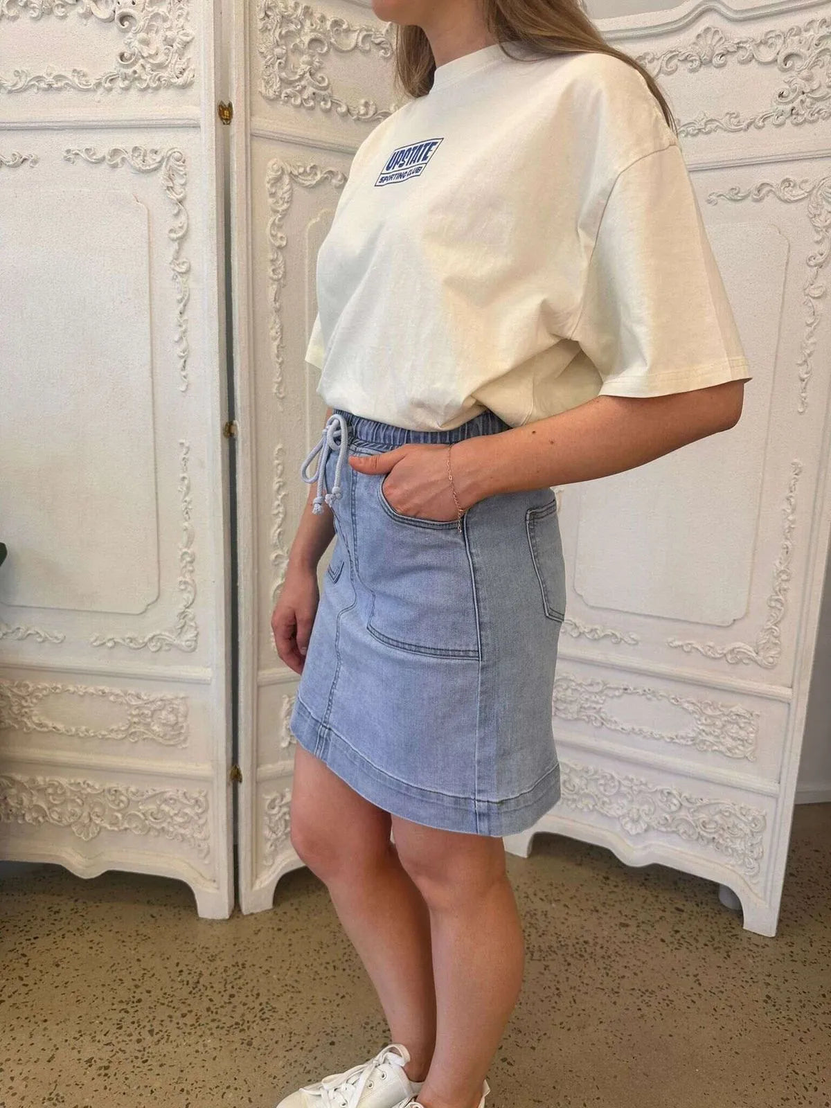 Dayna classic denim skirt with a drawstring front & elasticated waist, Featuring functional back and front pockets.