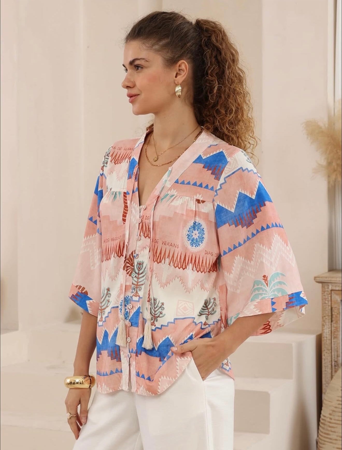 The Leia top has a relaxed, open silhouette, a no collar neckline and buttons at the centre front. The print is exclusive to Iris Maxi.