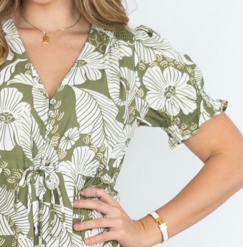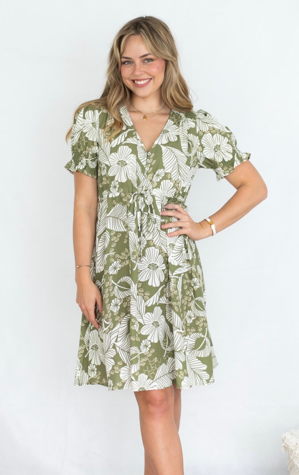 The Alexa Dress is made from 100% Viscose, ensuring maximum comfort. The V-neck and front button detail add a touch of playfulness to the elegant design. The waist tie cinches the dress, creating a flattering silhouette. Complete with short frill sleeves, this dress is perfect for any occasion.