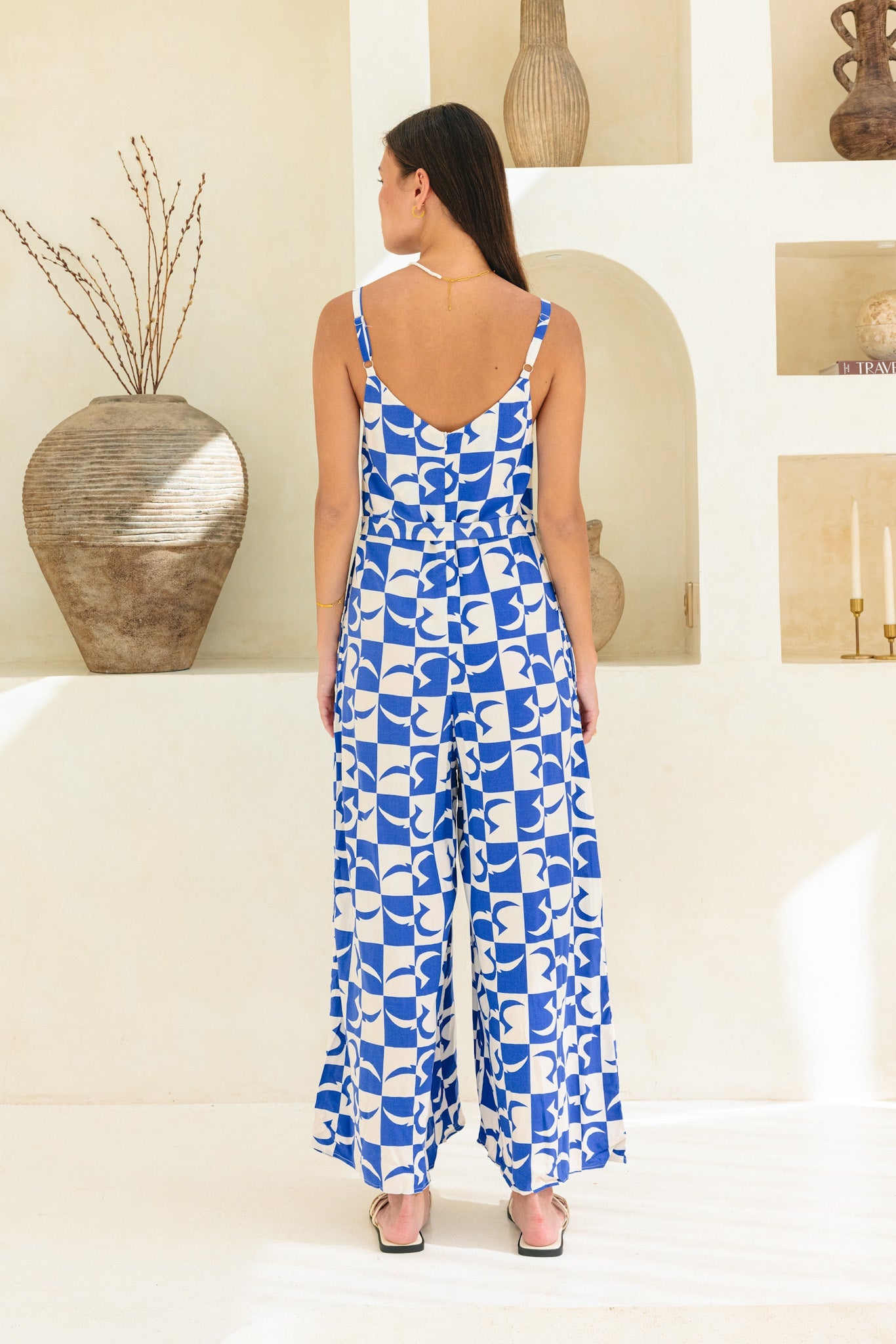 Step into vibrant style with Blue Geo Jumpsuit. This eye-catching ensemble features a playful V-neckline and adjustable shoulder straps for a customised fit.